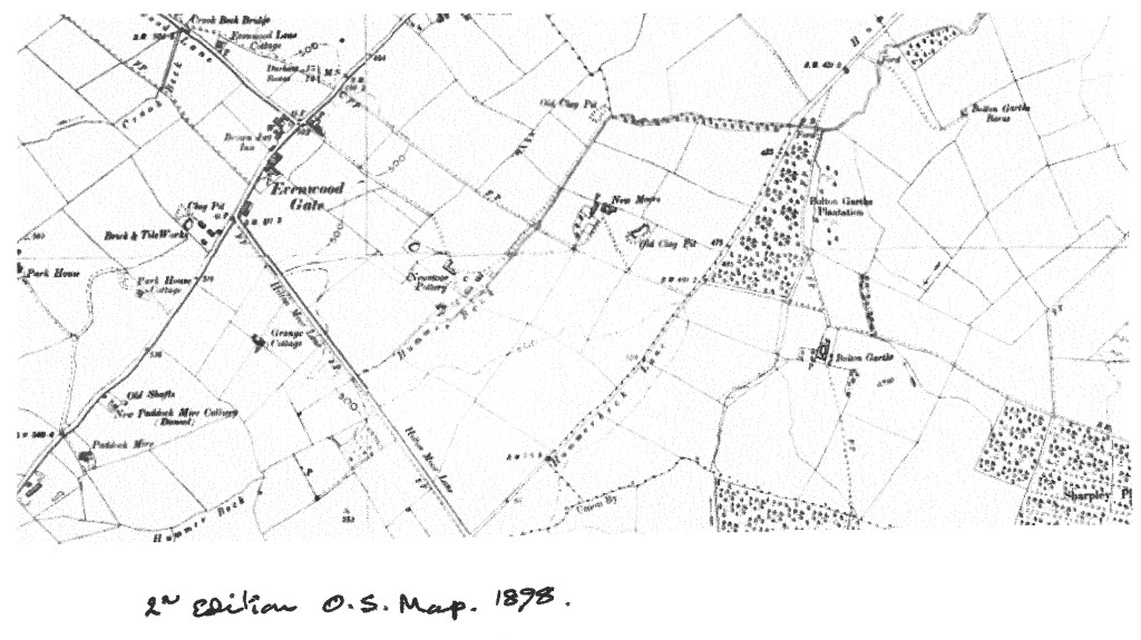 This map shows Newmoor Pottery, close to Hummer Beck and a clay pit to the north of New Moors Farm. There were other workings at Hilton Tarn Brick and Tile Works which were northeast of Wackerfield and the road to Hilton. To the south were Whinstone Quarries. Also, there were 3 small coal workings either side of Evenwood Gate and the Sun Inn road (now the A688) which were Park House Colliery,[16] an old coal pit near Park House Cottage and Paddock Mire Colliery.[17] Fireclay is often found within the coal seams and perhaps clay was brought out for use locally.
