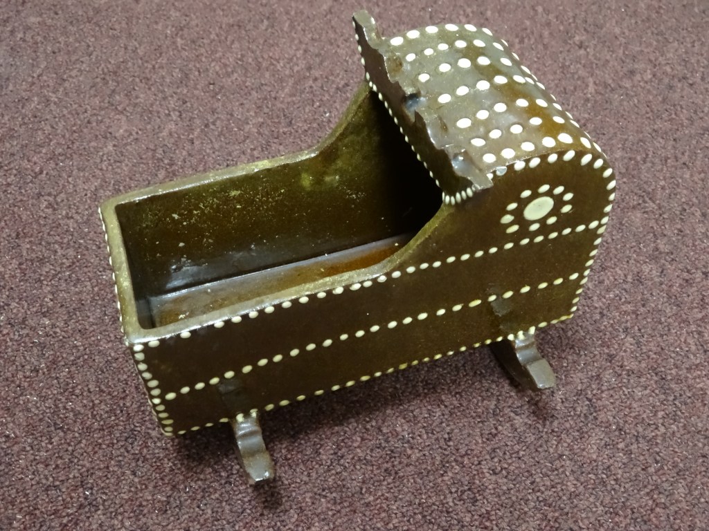 Salt jar with lid and a slipware decorated jug and below 2 cradles for small dolls.
