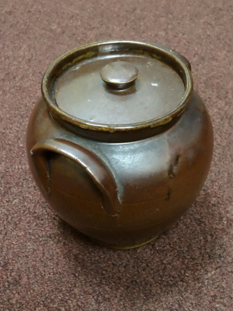 Most pottery was thrown on the wheel, but square and rectangular baking dishes were moulded. The clay was rolled out and either laid over a plaster mould, or placed in a hollow press-mould. The edges were scalloped with the thumb to leave gaps for the hot gases to escape when the dishes were fired face to face. For a short time, tea-pots were made, using press-moulded handles and spouts, but it was difficult to compete with factory prices.