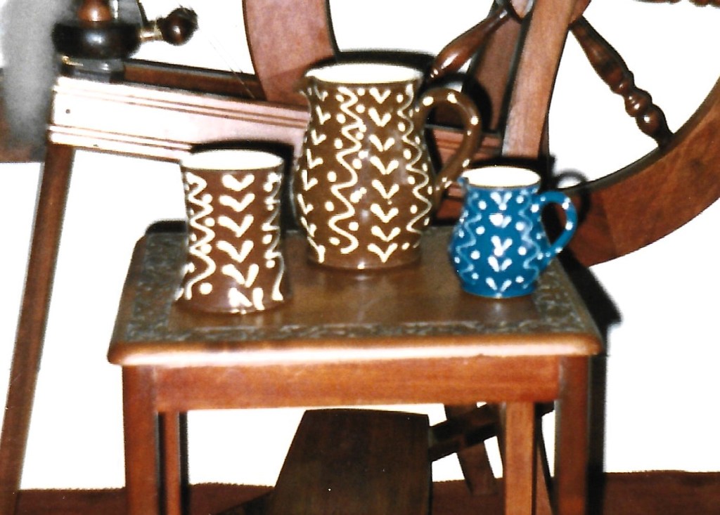 Decorated slipware. Most farm crocks were not decorated, except perhaps for a few lines of white slip, blown out of an earthenware bottle through a goose quill, while the pot was still on the wheel. Salt-pots and pie-dishes were decorated with patterns, the slip being trailed onto the damp clay from a cow’s horn with a goose quill in the tip. Two designs were traditionally used at Wetheriggs – a feather, and a wavy line with fronds on it. Over the years these designs were simplified into a more abstract pattern.