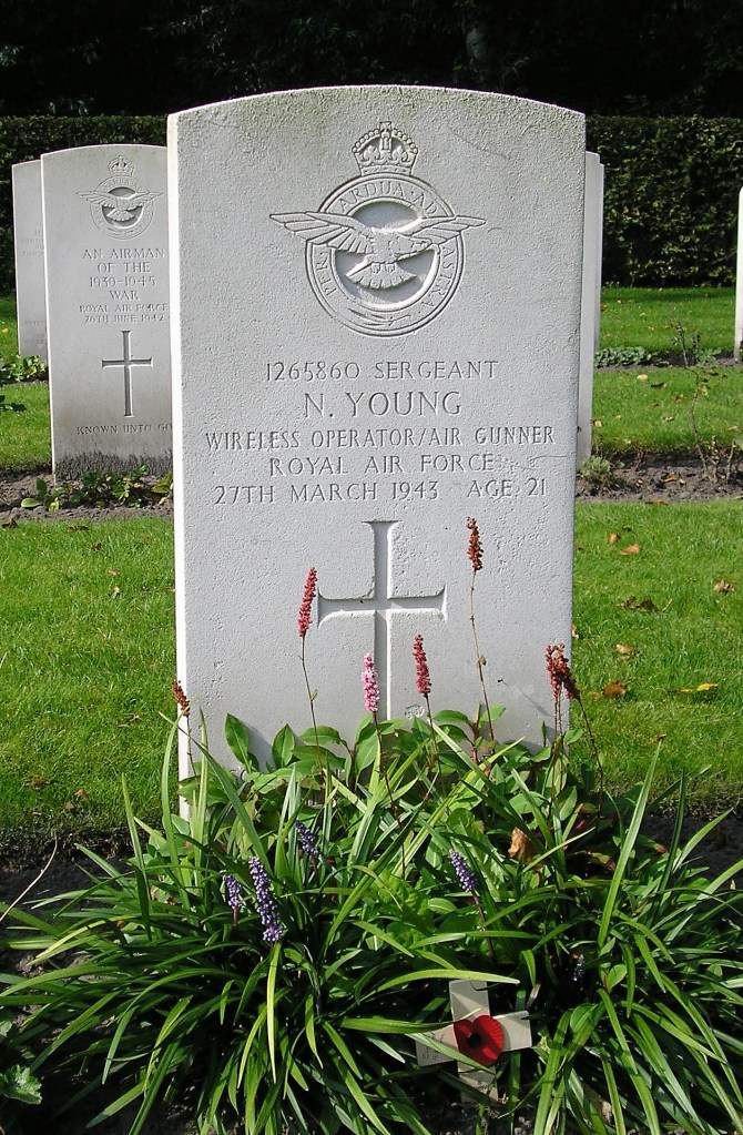 Sergeant N. Young was the Wireless Operator /Air Gunner on Stirling Bomber No. BF317 which took off from RAF Oakington, Cambridgeshire at 1940 hrs. 27 March 1943 for a raid on Berlin. It was later reported that his aircraft was hit by anti aircraft fire and crashed at Melchiorshausen, 10kms south of Bremen, Germany with the loss of all those onboard. [4] Other crew members were likely to have been: [5]
