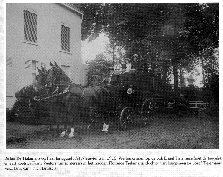 The Tielemans family on their Het Nieuwland estate in 1913. Emiel Tielemans, holding the reins, coachman Frans Peeters and at the back in the middle Florence Tielemans, daughter of mayor Josef Tielemans (courtesy of the Van Thiel family, Brussels)