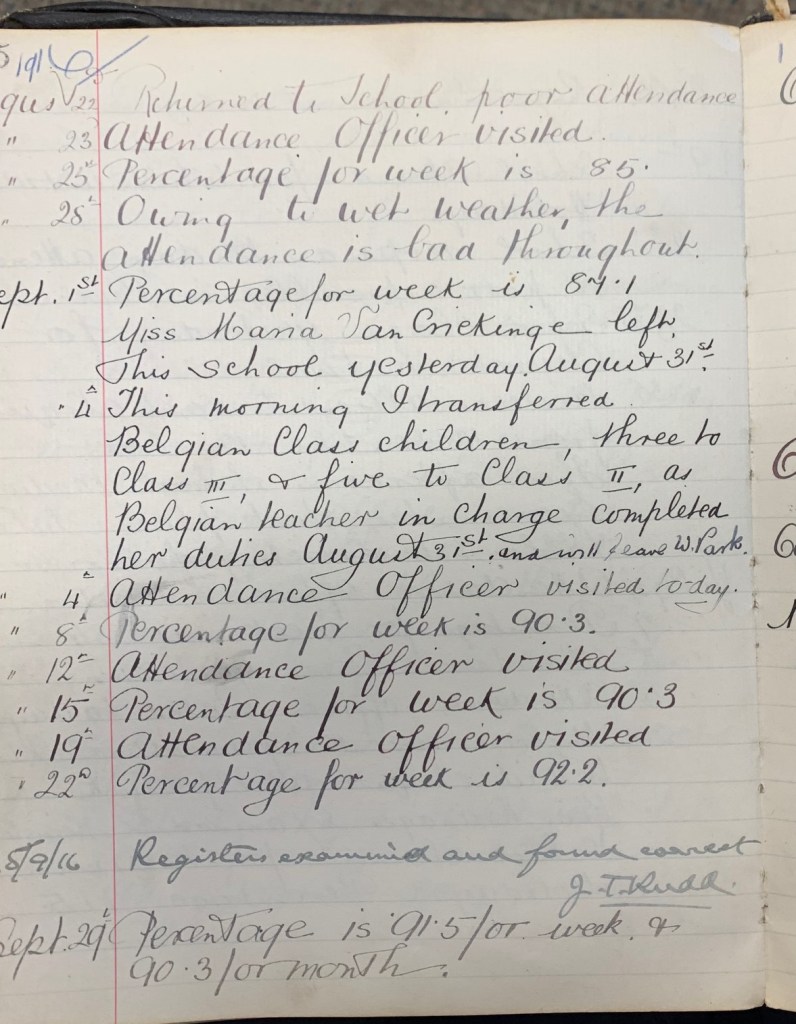 “This morning I transferred Belgian Class children three to Class III, and five to Class II, as Belgian teacher in charge completed her duties August 31 and will leave W. Park.”