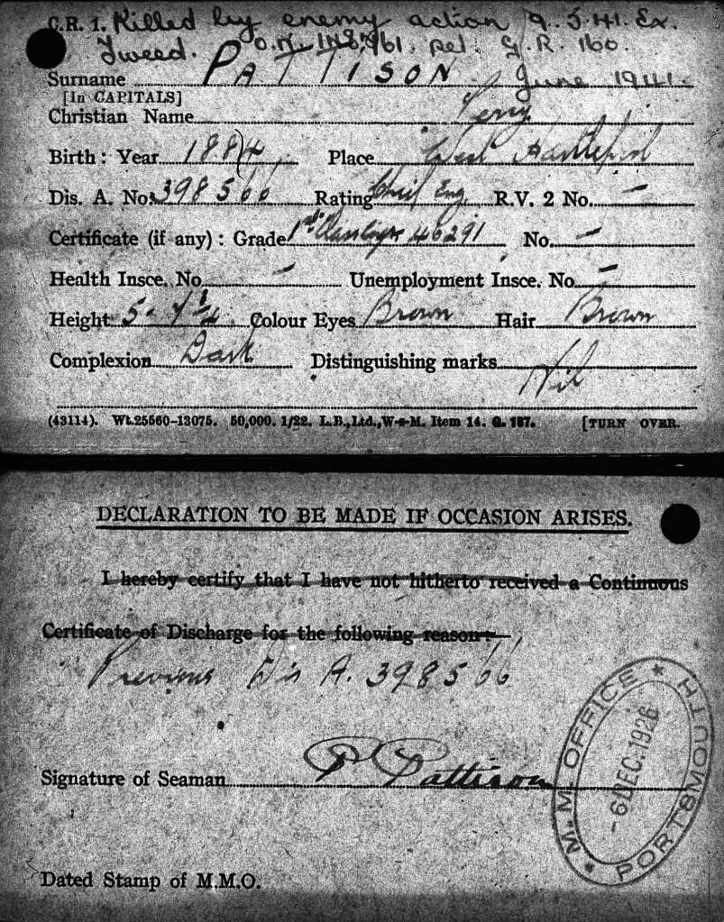1941: Percy Pattison died aged 56.[11] A note on his Registration Card states that, “Killed by enemy action 9.5.41 Ex Tweed.”