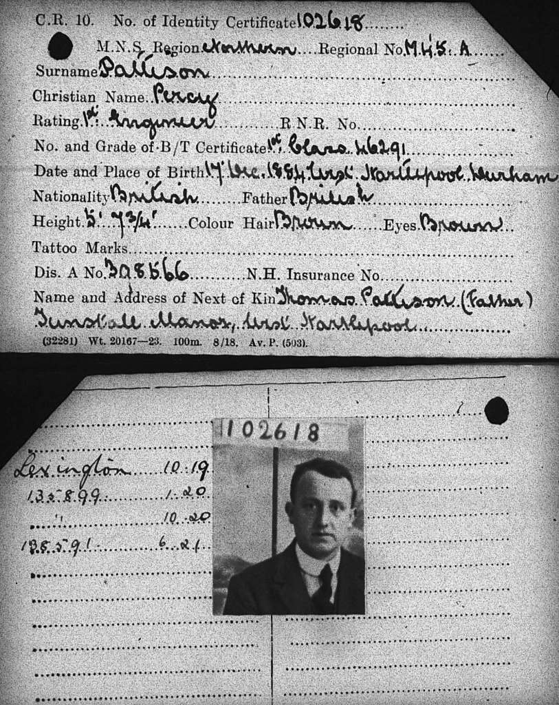 Percy Pattison was born 17 December 1884,[2] at West Hartlepool, the son of Thomas and Isabella. There were at least 7 children, Richard, Walter, Thomas, John, Elizabeth, Percy & Sidney. In 1891, the family lived at Rosebank, Gardeners House, Elwick Road, West Hartlepool. Thomas worked as a gardener.[3] By 1901, the family lived at Tunstall Manor Lodge, West Hartlepool, Thomas was still employed as a gardener. Percy now 17 years old was an apprentice engineer.[4] By 1911, Thomas and Isabella still lived at Tunstall Manor with 32 years old son (widower) Thomas and his son, 5 years old Walter. John and Elizabeth were at home. There were 3 lodgers, all single men and gardeners. Percy was not at home. [5] Percy served in the Merchant Navy (No. of Identity Certificate 102618 District A No.398566) and was a 1st Engineer, 1st Class (4691). He may have served aboard, the “Lexington” between 1919 and 1921.[6]