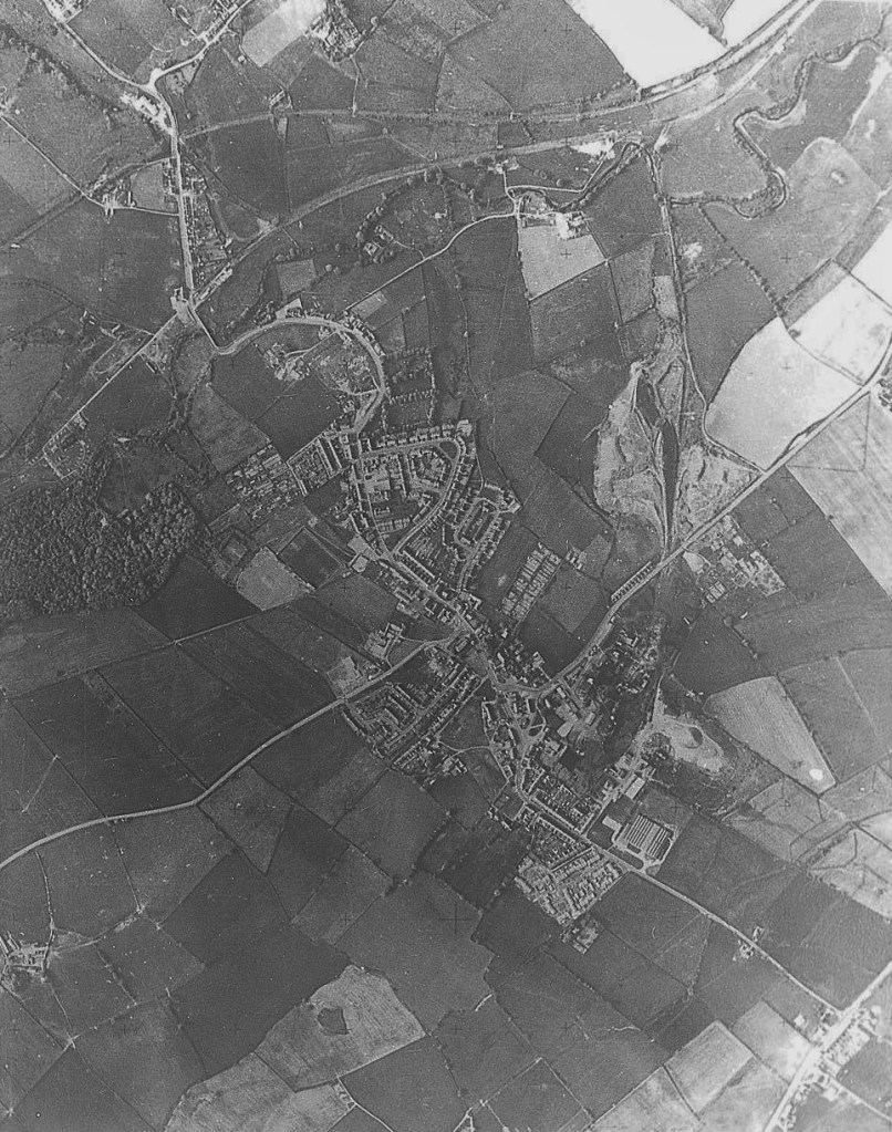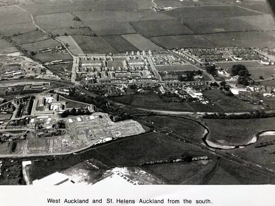 WEST AUCKLAND & ST. HELENS AUCKLAND – THE TRACK OF THE ETHERLEY INCLINE CAN BE SEEN TO THE LEFT MAKING ITS WAY UP TO THE HILLSIDE AND TO THE BOTTOM RIGHT ALONG BY THE RIVER GAUNLESS. THE PHOTO WAS TAKEN LATE 1960S WHEN THE COUNCIL HOUSES AT EAST GREEN, WEST AUCKLAND WERE BEING BUILT