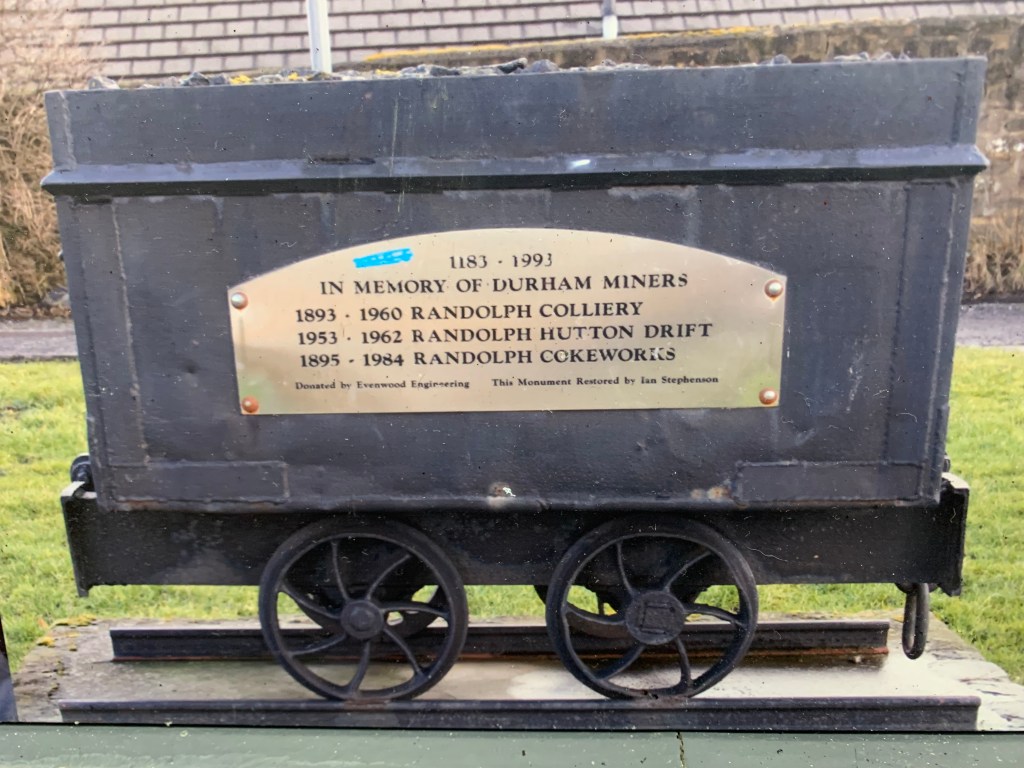 The Randolph Memorial Coal Tub was the idea of Mrs Peggy Fleming, of the Evenwood Tidy Village Committee, supported by Evenwood Engineering, CA Roofing, Randolph Coachworks, Coal Contractors, Durham Aged Miners Housing Association, Evenwood WMC, the Travellers Rest, the Dr John Neville Fund, Dr Joe Said and an anonymous donation. The coal tub was sourced by Cllr. John Armstrong, restored by Ian Stephenson a resident of Alexandra Terrace, Evenwood, the plaque was also fashioned by Ian Stephenson and donated by Evenwood Engineering and the plinth was constructed by John Weir of South View.