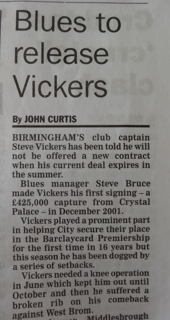 - 2001 – 2003: Steve Bruce’s first signing for Birmingham City was Steve Vickers in a £400,000 deal. He made only 14 appearances, scoring 1 goal and was a member of the squad which gained promotion to the Premier League in 2002. In 2003, following 2 injury plagued seasons which included a knee operation, a broken rib and a badly gashed ankle, Steve Vickers retired from professional football after a long and respected career.