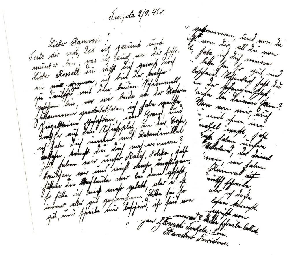 I want to inform you that I am safe and sound which I hope is also the case with you. Dear Russell, you’ll surely remember me, I am the one who, during the time of the Germans, used to drive the two grey horses when the two of us worked together in the barracks. I used to transport bricks and gravel and later to the shooting practise ground, near the railway. I used to provide you with food, can you remember? Now we have got our Polska (Poland), now we needn’t be afraid anymore, if the guards had caught me, I wouldn’t have been alive but things always went well. Please be so kind as to inform me, you were taken from Tuchola to Thorn and from then on I don’t know anything about you. Hopefully, you survived your captivity well and you are quite well at home with your parents? Please give my regards to your parents as well as all the comrades you were with in the camp at our place, Tuchola. Now, I’m quite fine. We have got our freedom and our fatherland, the devil shall take the Teutons, we have endured enough. Dear comrade, don’t be cross with me for writing in German. I wanted to write in Polish but I thought you wouldn’t be able to read it in Polish. For the time being, everything stands as it was, best wishes from your friend and comrade. Please write back soon. My address, Jan Glowacki, Tuchola, Pom Starostwo Powiatowe.