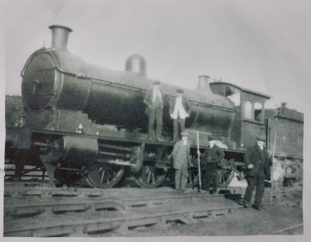 Below: Cockfield sidings: George Robson, right hand side holding the shunter’s stick. He lived at Low Lands cottages and was known as “Shunter Geordie”.