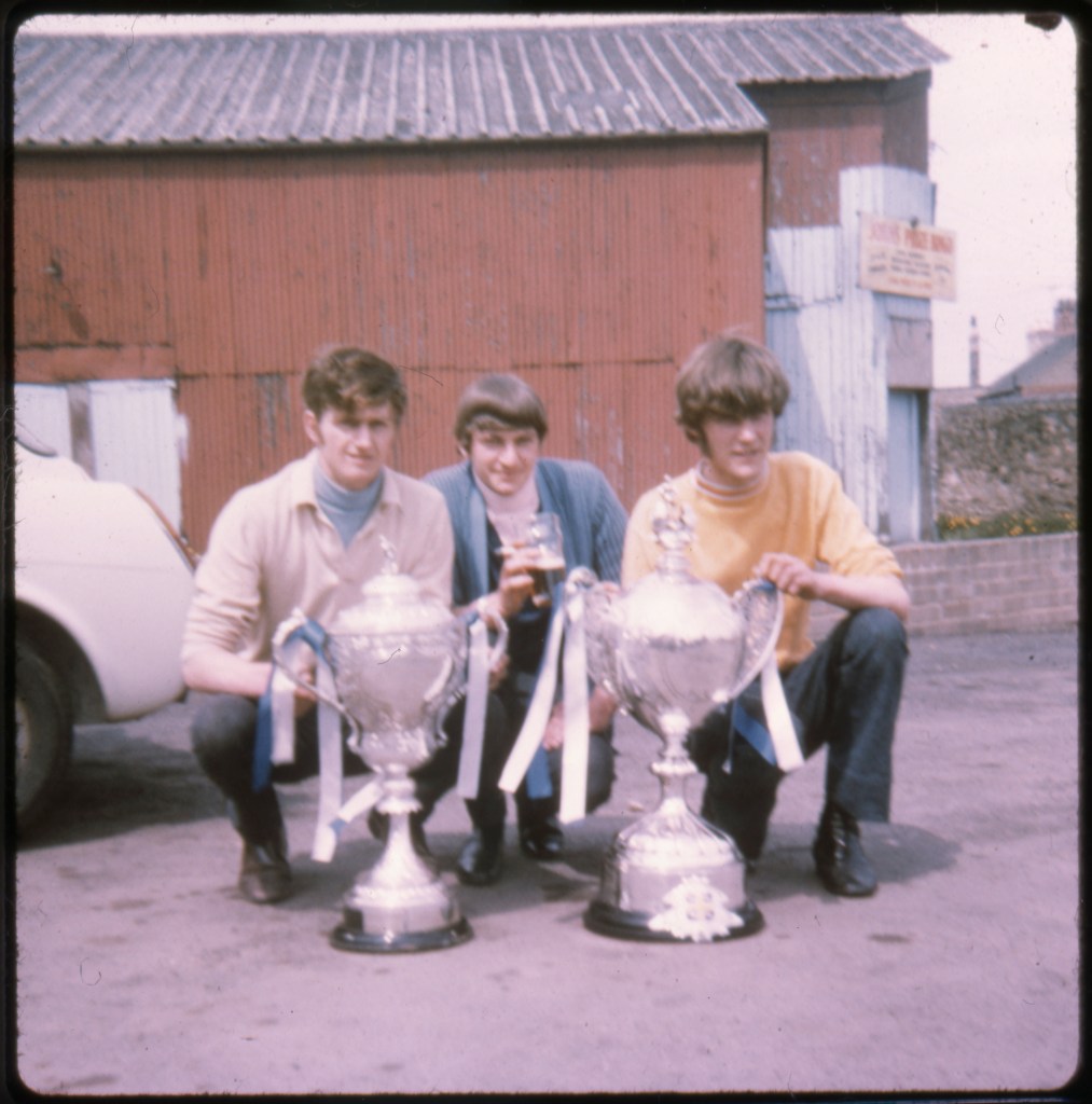 Below: 1970 Evenwood Town F.C. silverware on show outside the Social Club and the Jira. Jeff Carrick, Brian Harris, Bob Black.
