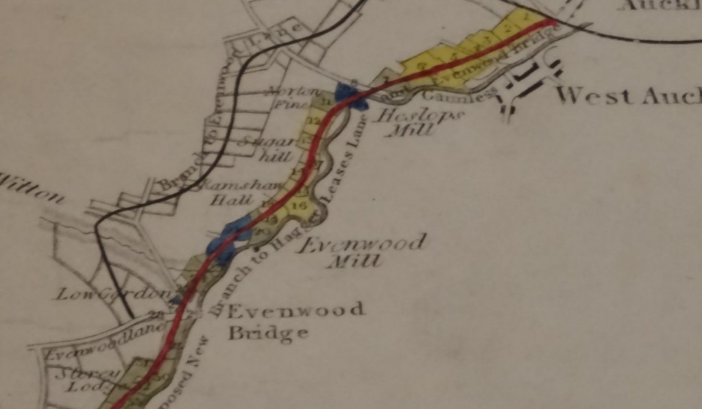 1823: Detail from the submitted Quarter Session Deposited Map to show the amended route of the Haggerleases Line. It clearly shows Evenwood Mill.