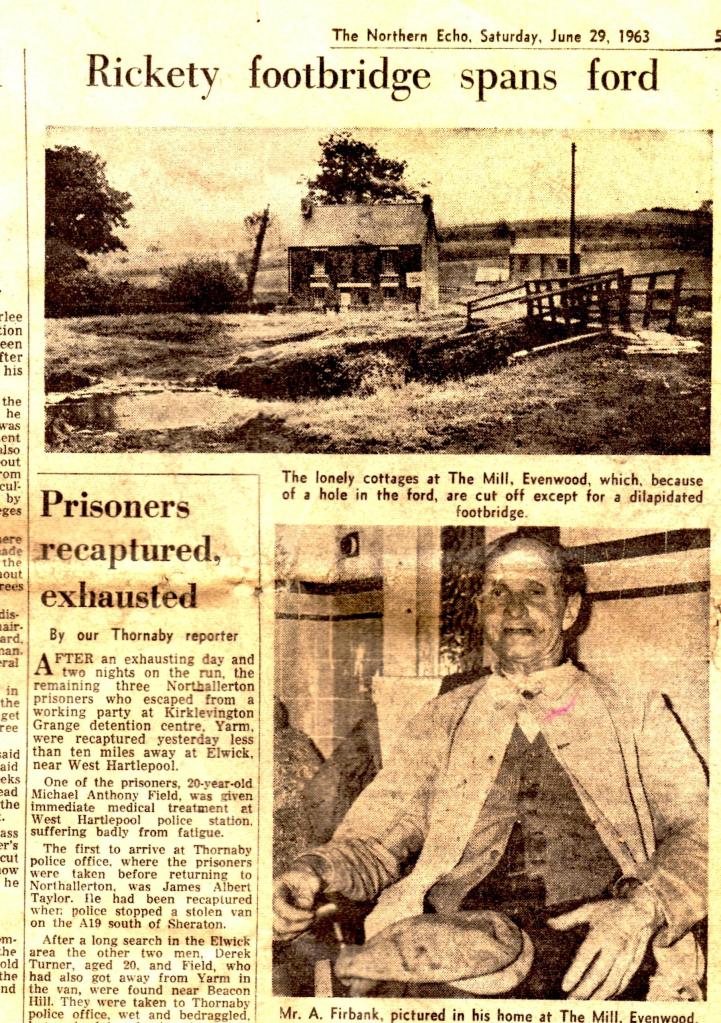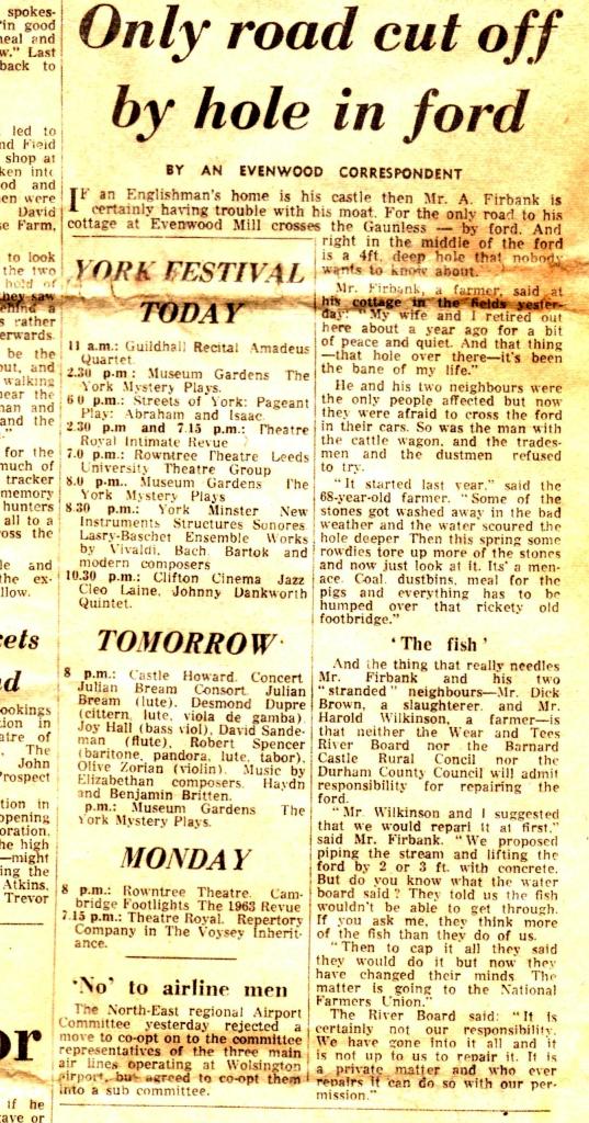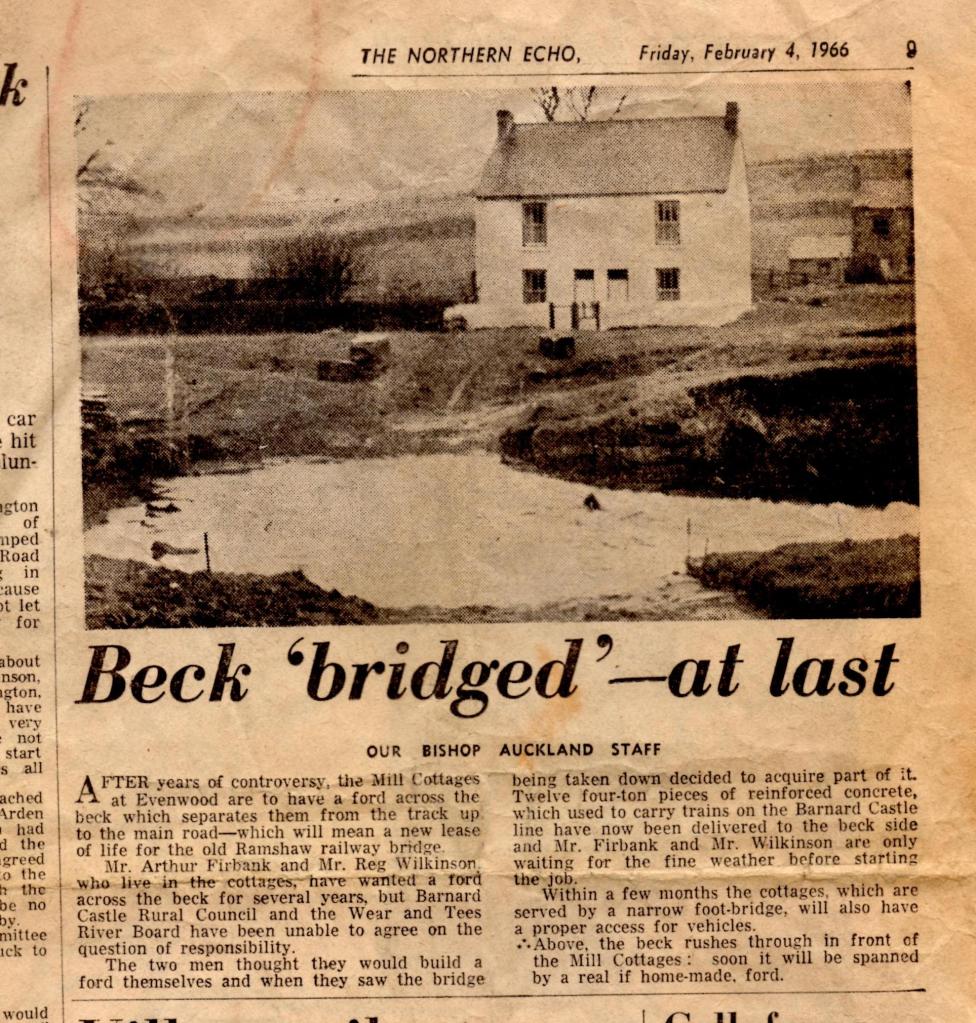 Here’s 2 articles dated June 1963 and February 1966 which refer to the ford over the River Gaunless. Apparently, a 4 foot hole appeared, it needed to be repaired. Some residents were cut off – Mr. Arthur Firbank, Mr. Dick Brown and Mr. Harold Wilkinson. It looks like they managed to salvage a bridge from the railway company and put it up themselves.