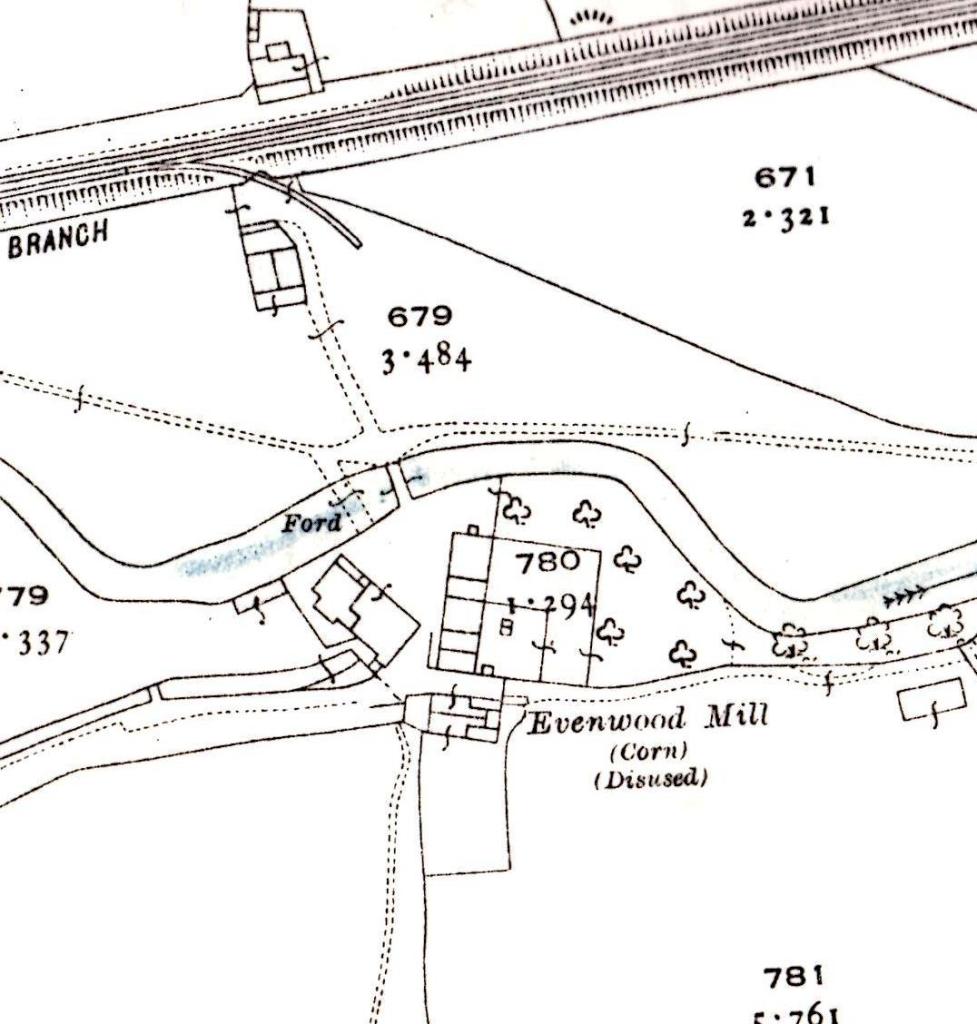 Below: Here’s a map dated about 1920. The mill looks as though it has been demolished. The miller’s house is clearly standing. It shows the ford, the footbridge and the 2 houses over the other side of the river.