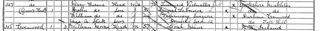 Mary Burnie, aged 78 was the “Licensed Victualler” of the “Queen’s Head”. She was born at Mickleton, Yorkshire, as was her 51 years old son John, a general labourer. Her younger son was 44 years old, William who was born at Evenwood. He was employed as a veterinary surgeon. A domestic servant, 19 years old Jane A. Stirk, lived and worked for her.