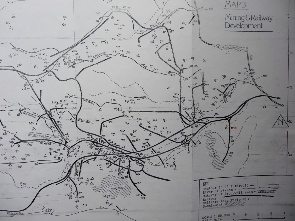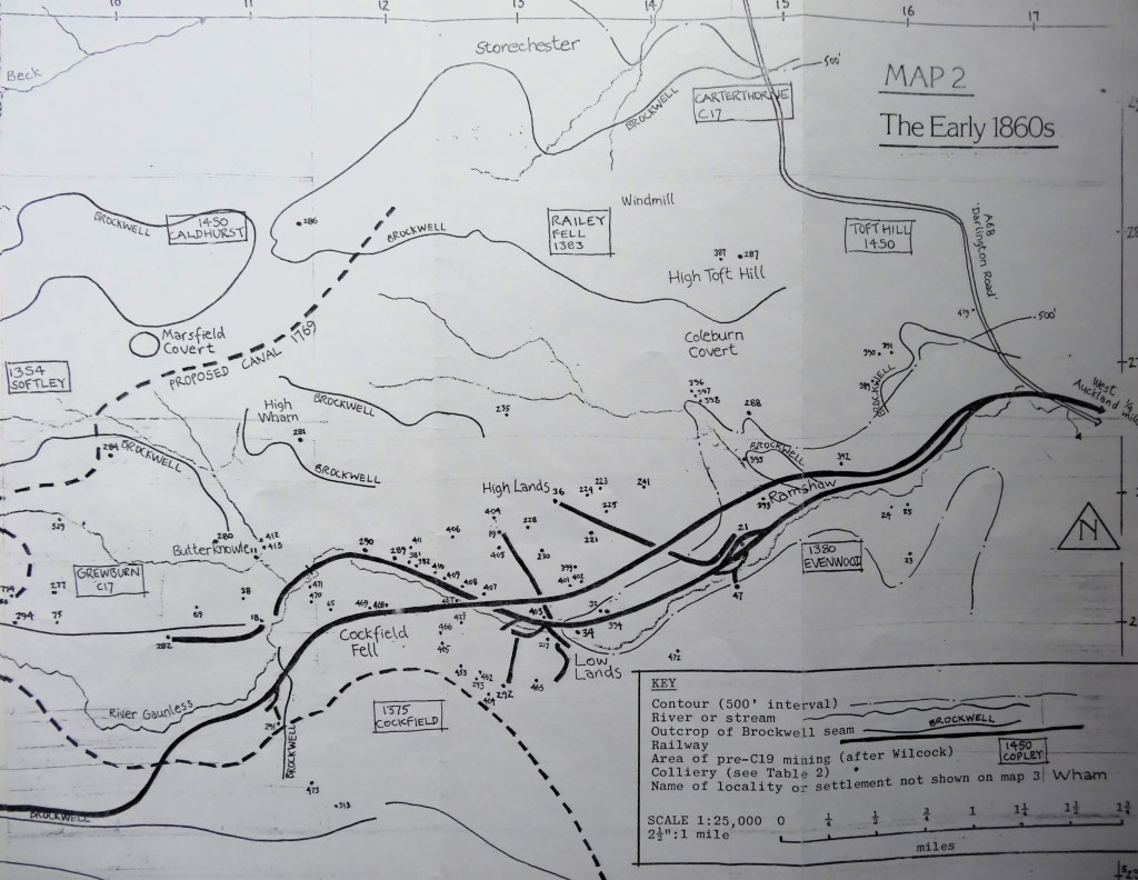 The seam which outcrops most extensively in the area, and which has been mined to the greatest extent, is the Brockwell seam. In simple terms there are 7 localities in which the seam outcrops, all of which have been the centres of mining and railway development. On the northern ridgeline of the valley the seam outcrops on both sides of the ridge about 30’ below the ridge top. For most of the length of the ridge (ie. Between Woodland and Windmill) there is no overlying seam and this encouraged early mining here by bell pit. The seam outcrops on both sides of the ridge which runs west from Butterknowle to Woodland. The coal measures are faulted in this area – in places the Brockwell seam lies at considerable depth. All other seams above the Brockwell apart from the Durham Low Main also outcrop and have been mined in this area. These first two areas come together in the vicinity of Woodland. The Brockwell outcrops in a small area to the east of Butterknowle between High Wham and High Lands, where it has been raised in a block by faulting. It lies at a depth of up to about 25’ but both Brockwell and an unnamed seam of up to about 20’ have now been completely removed from this area by both underground and opencast mining. The Brockwell seam underlies Cockfield Fell where it lies beneath the Busty seam at a depth of 100’. The Brockwell outcrops to the west and south of the Fell and both seams have been extensively mined on the Fell for several centuries. The seam outcrops in the vicinity of Ramshaw on the lower valley side. All other seams overlie the Brockwell here and outcrop successively on the hillside above. The Brockwell seam outcrops in the valley of the Arn Gill, west of Copley, where the Busty seam also outcrops. The seam also outcrops to the west of Woodland in the valley of the Hindon Beck where the Busty and Tilley seams also outcrop.