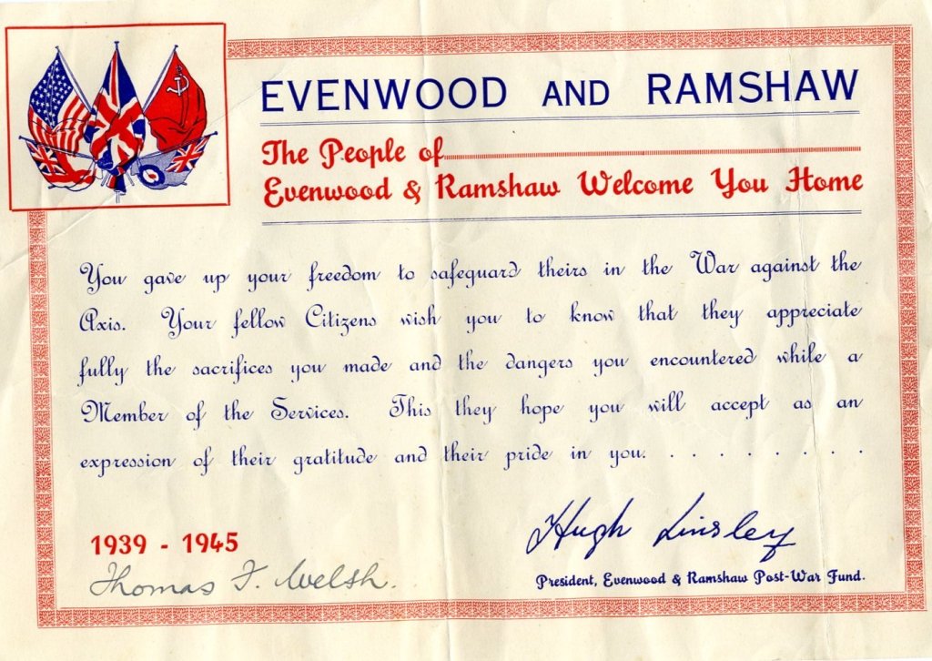 Thomas Featherstone Welsh was born 4 September 1912[2], the son of Robert and Julia Welsh and brother to Norah, Robert [Bob] W., Harry, Sarah [3] and George, John James, Gibson.[4] In 1939, the family lived at 13 Swan Street, Evenwood and Thomas is recorded as working as a Government Works Assistant [or draughtsman’s labourer].[5]