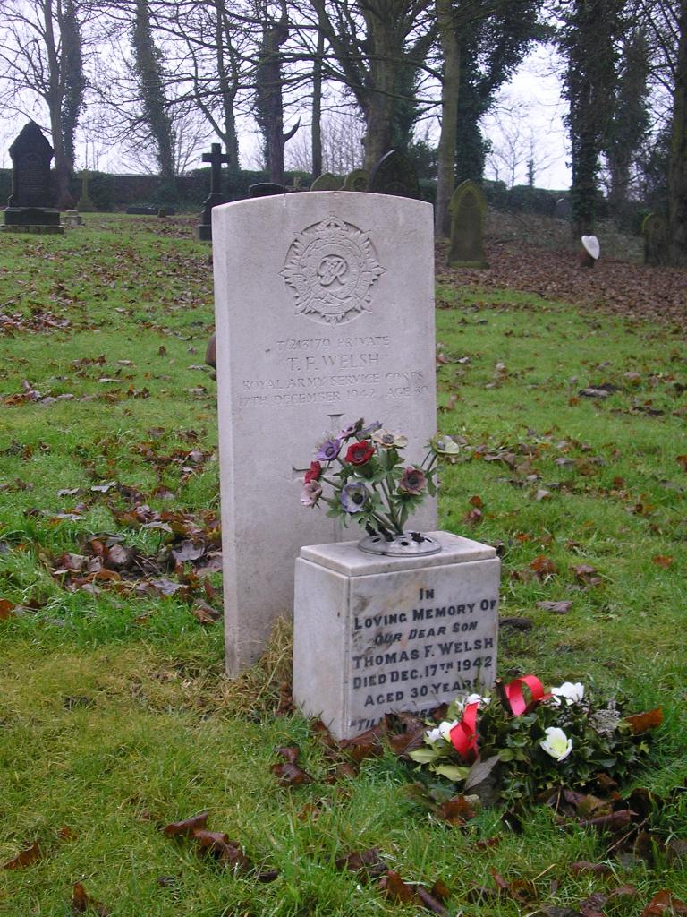 Private T/213179 Thomas “Tot” Featherstone Welsh served in the Royal Armed Service Corps and died 17 December 1942 aged 30.[1] He is buried at home in Evenwood Cemetery.