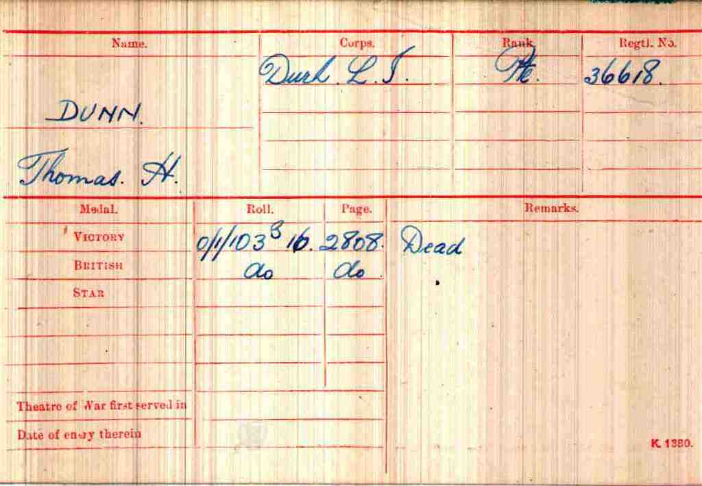 Private T.H. Dunn is commemorated on the Evenwood War Memorial, the memorial plaques in St. Paul’s Church and Evenwood WMC.