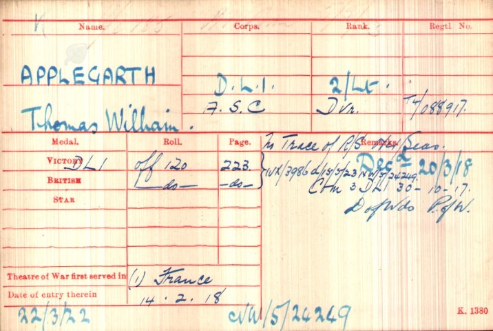 Second Lieutenant T.W. Applegarth was awarded the British War and Victory medals.[17]