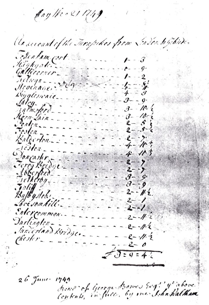 George Bowes would have travelled by horse and carriage. The route was from Tottenham Court via Highgate, the next place cannot be deciphered, Welwyn, Stevenage, Biggleswade, Sandy, Tempsford, Horn Lain ( a modern name cannot be traced), Ponton (south of Grantham), Balderton (south of Newark), Weston, Doncaster, Ferrybridge, Abberford, Wetherby, Topcliffe, Busby Stoop, Lovesome Hill, Entercommon (the modern day name has not been traced), Darlington, Sunderland Bridge to Chester (le-Street). This road was commonly called, “The Great North Road” and the part through North Yorkshire was called, “The Post Road”. Later, much of the route would become the A1. In total, there were 24 toll gates and the total cost was £3…. 9 shillings… 4 and a half pennies. This would be about £900 in today’s money.
