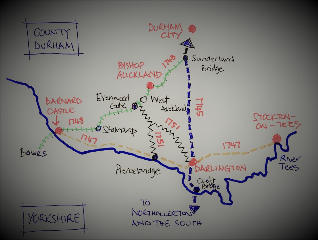 - 1745 The Post Road: Borough Bridge to Durham via Northallerton, Croft Bridge and Darlington. 52 miles via Topcliffe, Thirske, Northallerton, Croft, Darlington, Aycliffe village, Ferryhill and Croxdale. There were 7 toll gates at Topcliffe, Newsham, Lovesome Hill, Entercommon, Croft Bridge, Harrowgate Hill/Aycliffe village & Sunderland Bridge [Croxdale]