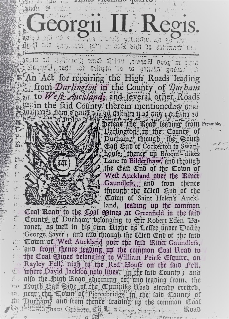 As a result, the turnpike road system was more developed in the south of the county. The”Coal Road” was one of the most important turnpike roads, which connected the West Auckland area to Darlington – now the road is the A68. This turnpike road was required, to cart coal from the pits at Greenfield for Sir Robert Eden and Rayley Fell for William Pierse esquire to Darlington, Richmond and elsewhere.