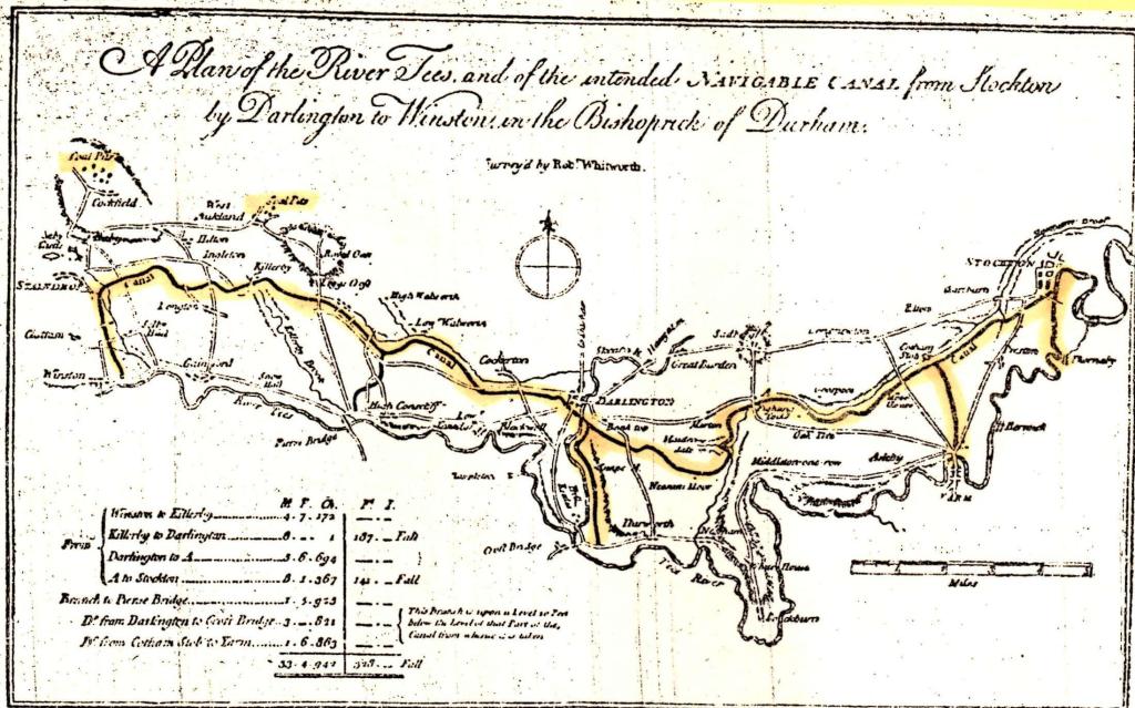1770: One canal scheme was surveyed in 1768 was relevant to our area. Coal from the largely unexploited Auckland Coalfield was proposed to be transported to the port at Stockton. It failed to gain support. The proposed route was from Stockton via Darlington to Winston and followed a line south of the higher land from Brussleton to Cockfield to Woodland. It came close to Denton, Killerby, Ingleton and Staindrop.