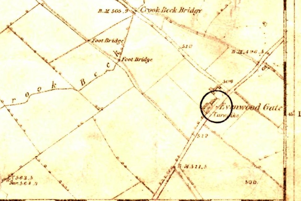 1859, the map below shows the turnpike road passing Evenwood Gate – the gate was on the turnpike road, required to prevent passage of carts so they could be stopped and charges collected.