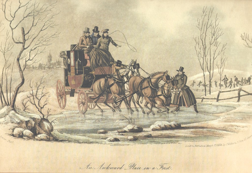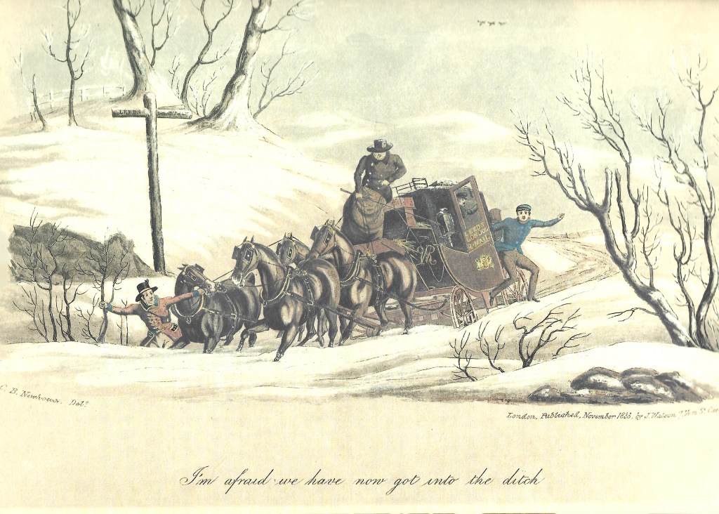 Below: 2 illustrations of a “romantic style” which show travel by coach – they depict the hazards of travel.