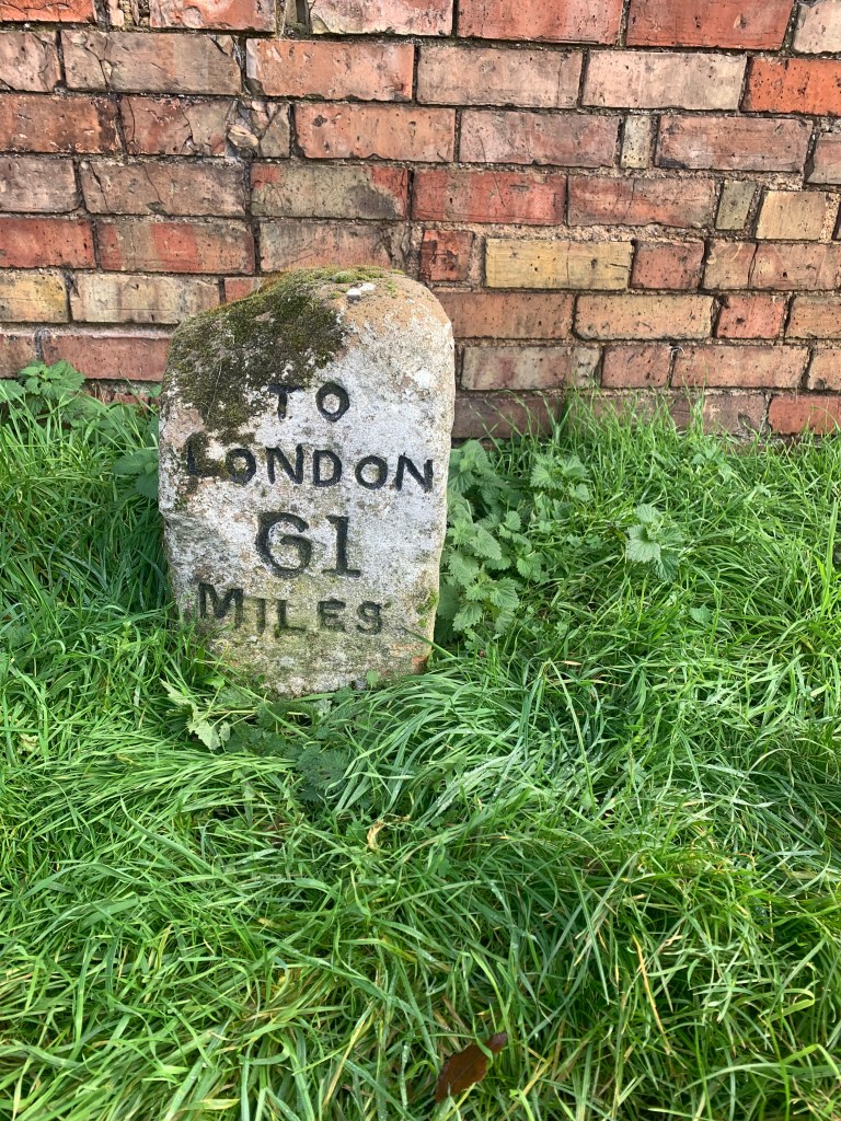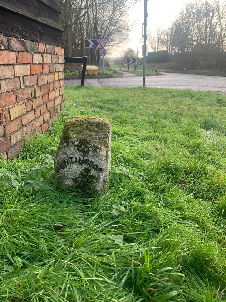 Around Huntingdon, there were 2 alternative routes but modern road improvements has obliterated most of the evidence. However, at Ermine Street (named after a Roman road) at Great Stukeley, to the north of Huntingdon, a milestone still exists – a rare example. London is 61 miles and Huntingdon 2 miles.