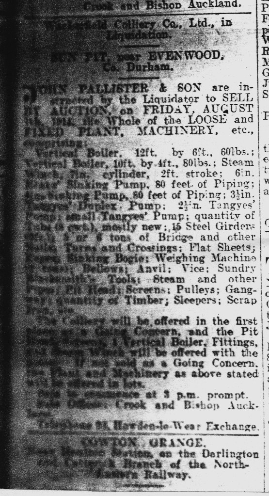 In 1914, the company went into liquidation. George Henry Raine was the manager at this time. The Sun Pit was offered for sale as a going concern in August 1914. The auctioneer was John Pallister & Son, who had offices at Crook and Bishop Auckland.[12]