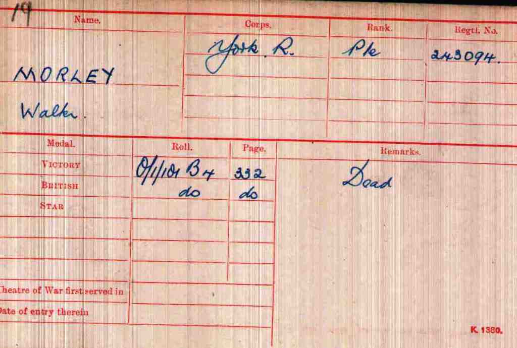 Walter Morley enlisted at Bishop Auckland into the Yorkshire Regiment being given the regimental number 243094.[7] The service record of Private Walter Morley has not been researched so the date he enlisted is unknown. Since he was not awarded the 1914-15 Star then he did not enter France until after 31 December 1915.[8]