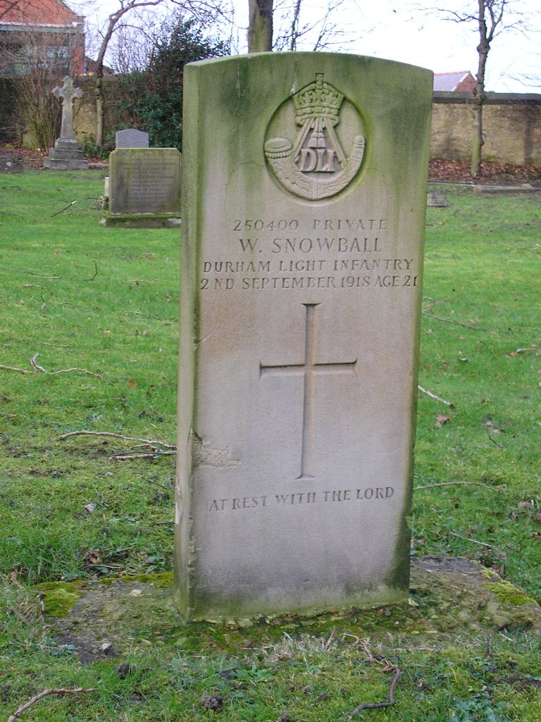 Private Walter Snowball is buried in Evenwood Cemetery. The Evenwood Parish Magazine carries a list of burials from July 1918 to February 1919 and includes the following entry: [24]