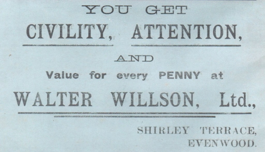 At its height, the Walter Willson chain of shops reached 185 outlets throughout the northern counties. Known simply as “Walters,” the shop at Evenwood dates back to at least 1914. In 1998, when the family owned company was bought out by “Alldays,” there were 48 stores, including the one at Evenwood. Since then there have been several changes in ownership and currently (July 2023), the shop is under the “McColl’s” trade name which, since 2022, has been part of the Morrison franchise.