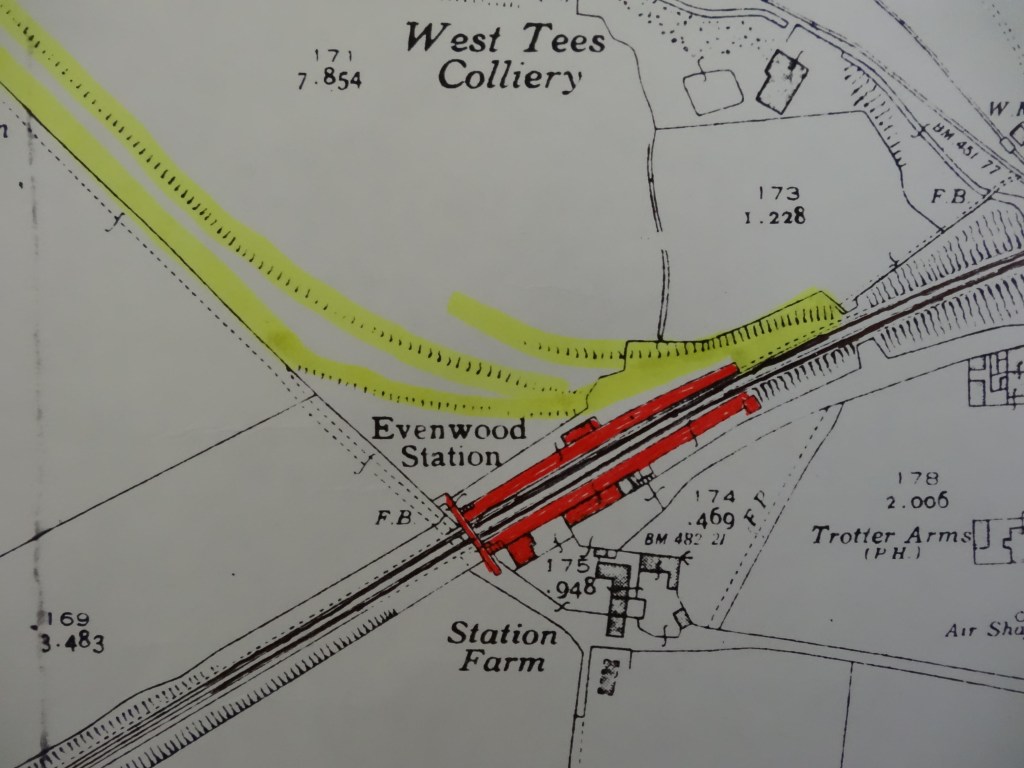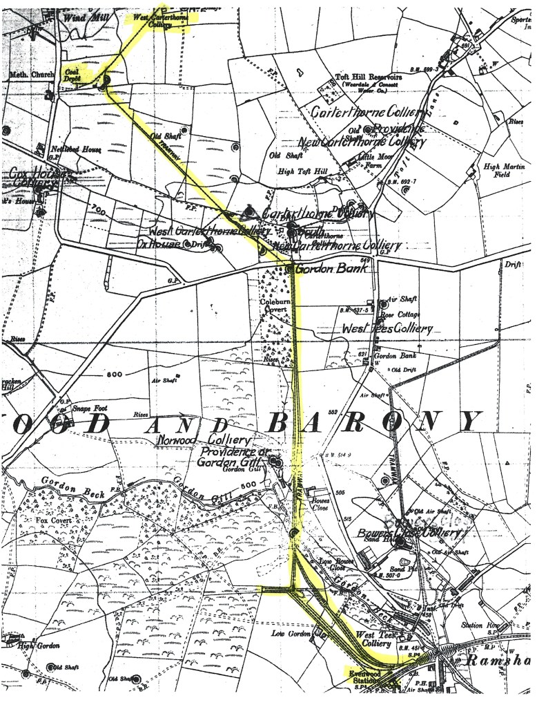 The 2 tramways ran alongside each other south of Carterthorne Colliery. There was a junction to the immediate east of Evenwood Station.