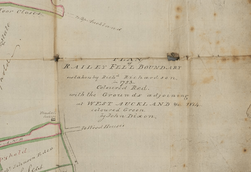 [1] Durham University Library, Archives and Special Collections. Durham Bishopric Halmote Court Records: Court and miscellaneous books, reference: DHC11/VI/57a 1814 Plan of Railey Fell Boundary as taken by Richard Richardson in 1753 with grounds adjoining at West Auckland etc.