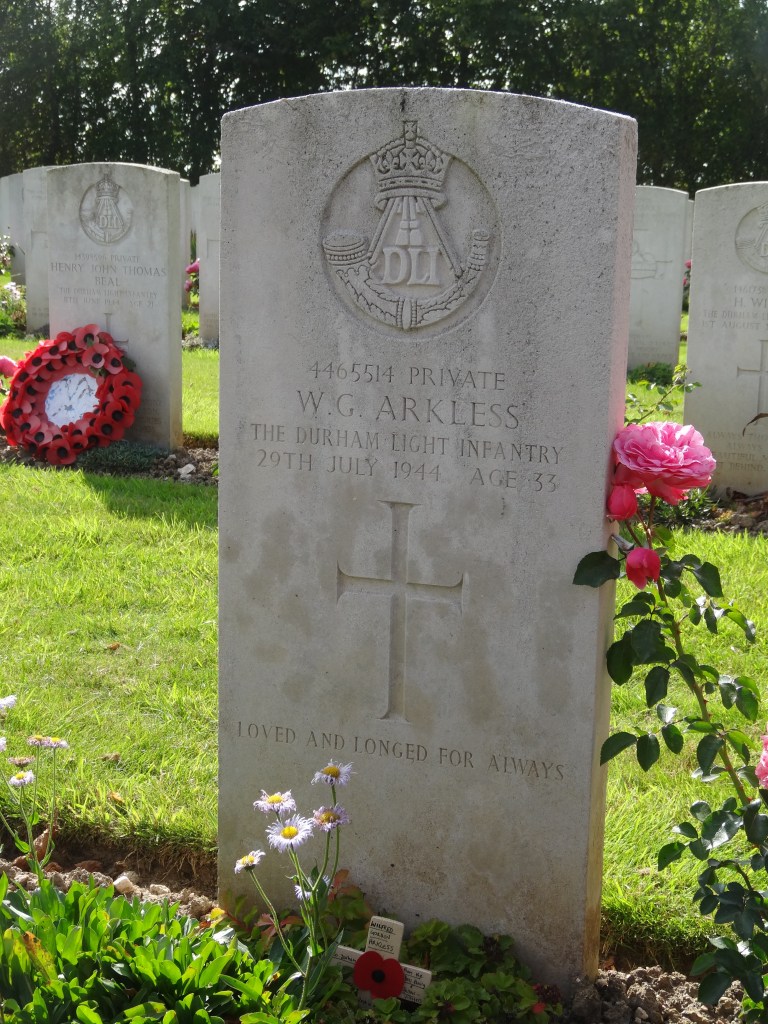 Private W.G. Arkless is buried at grave reference II.D.11, Tilly-sur-Seulles War Cemetery. It contains 990 Commonwealth burials of WW2. His epitaph reads: