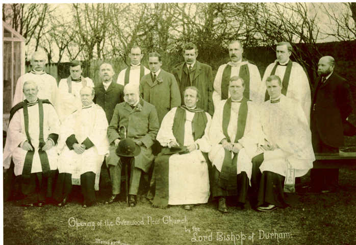 Below: March 1909: The opening of the rebuilt St. Paul’s church at Evenwood following its destruction by fire. William Randolph Innes Hopkins is sat in the centre holding walking stick and bowler hat. At the time, he was 81 years old.