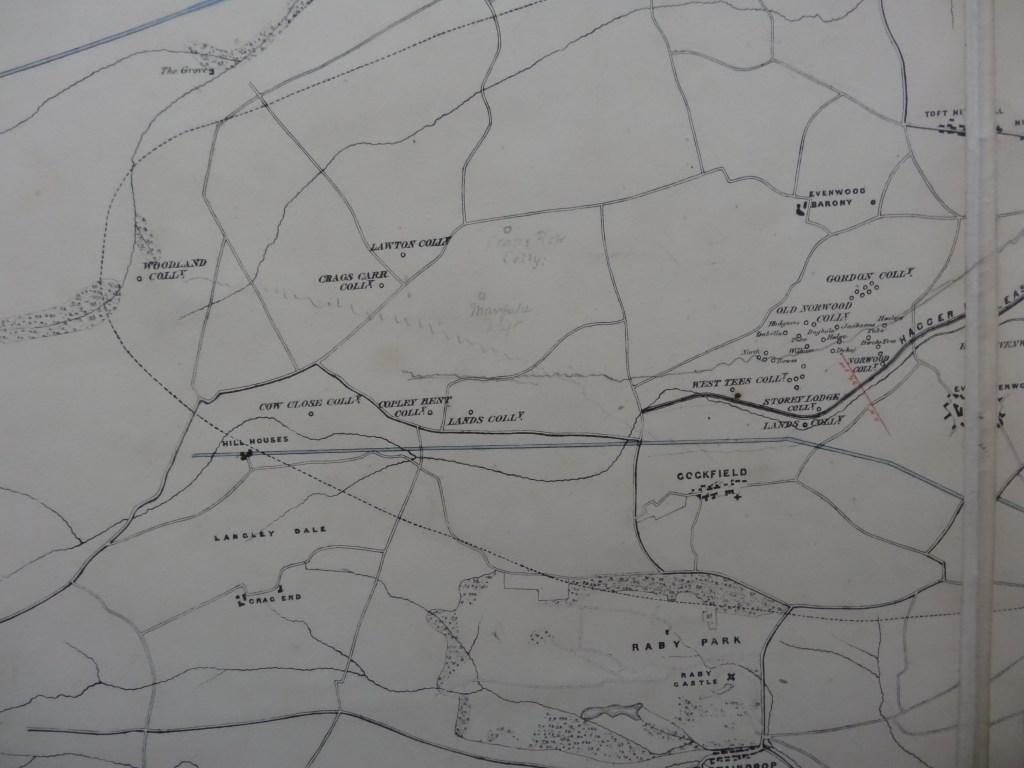 The Crake Scar and West Pitts Royalty was owned by the Bishop of Durham and leased to the Duke of Cleveland. Pits were worked on a limited scale prior to the 1870s. The map below is dated 1851 (by William Oliver, Mining Engineer and printed by M. &. M.W. Lambert, lithographers) shows scattered colliery workings north west of Cockfield at Woodland, Crags Carr and Lawton. Cow Close, Copley Bent and Lands are located to the west of Cockfield and north of the River Gaunless. Marked in pencil are Crake Scar Colliery and Marsfield Drift.
