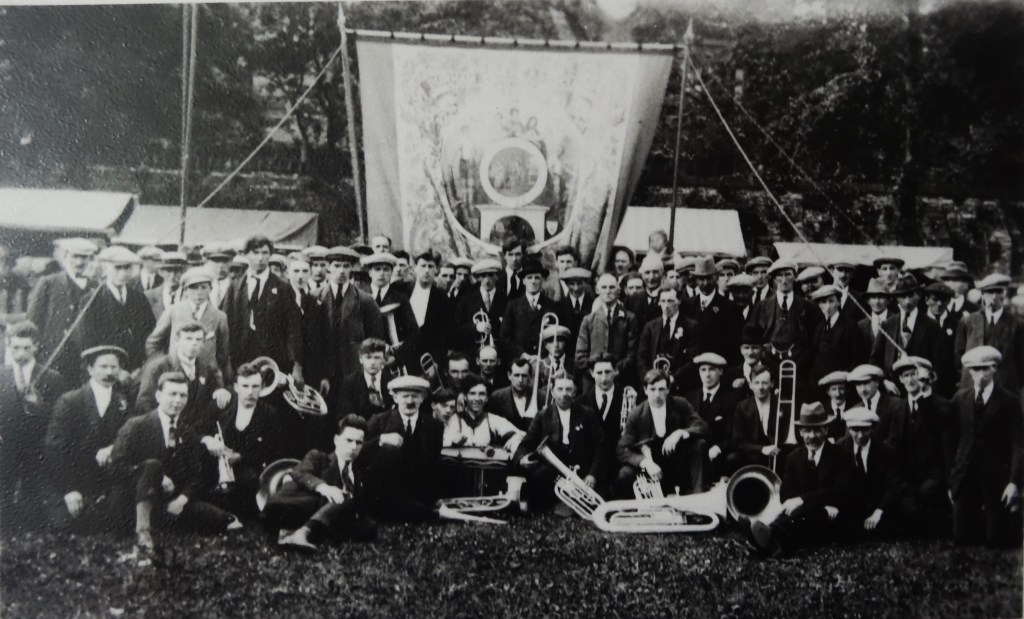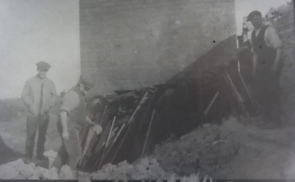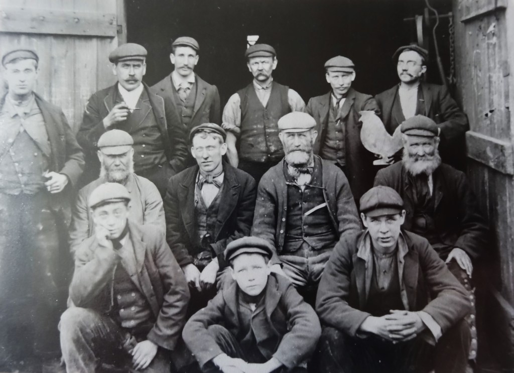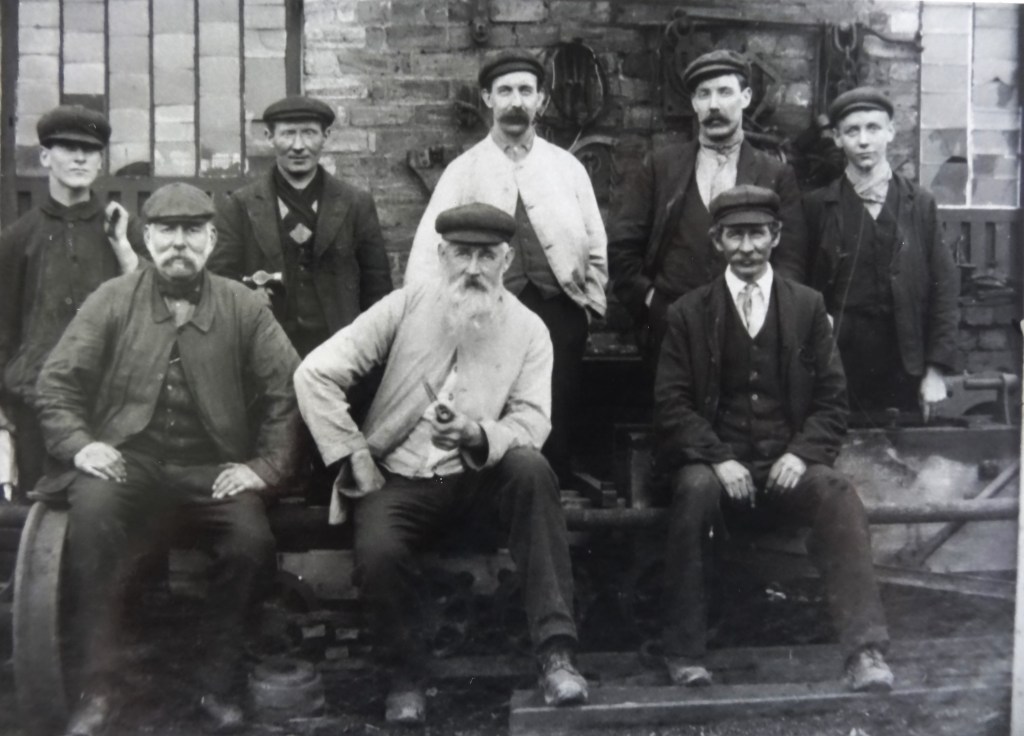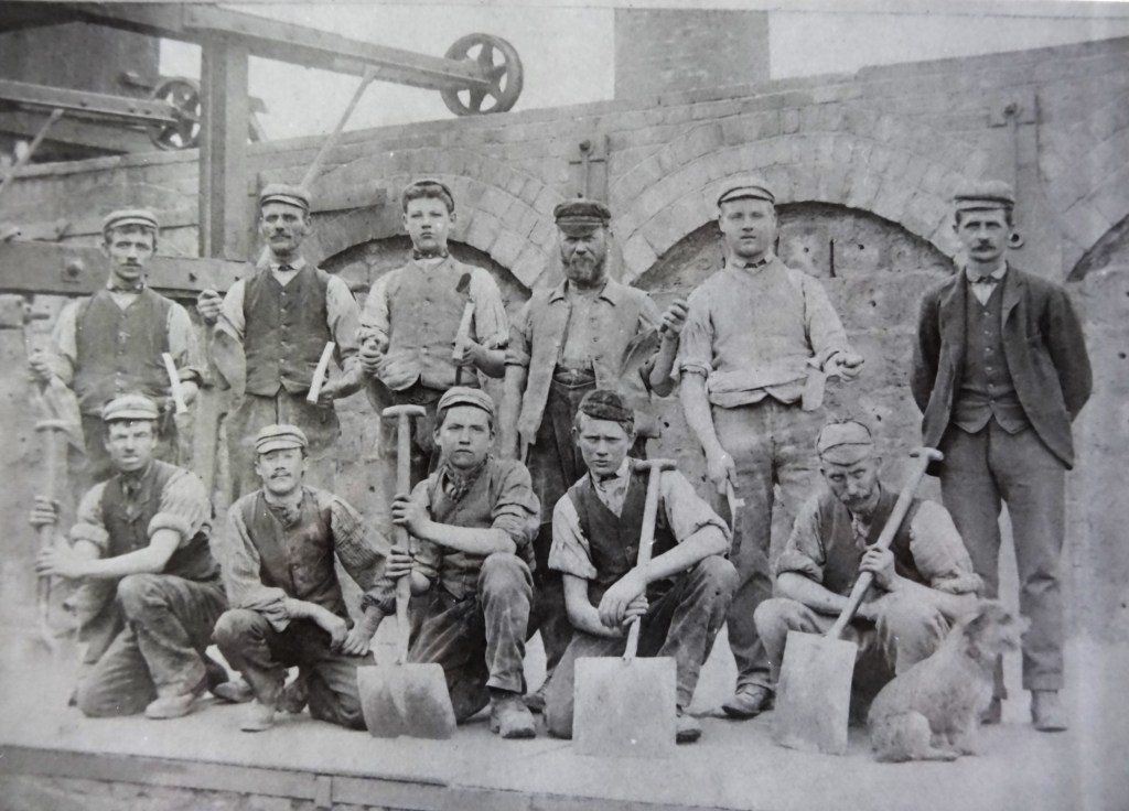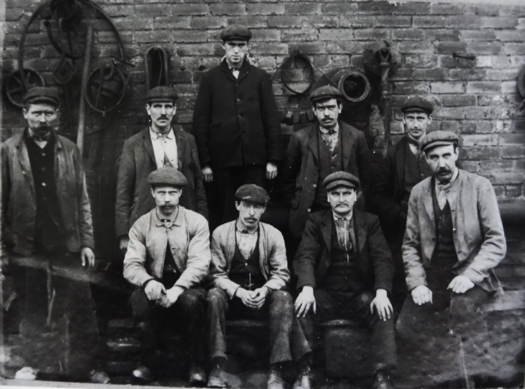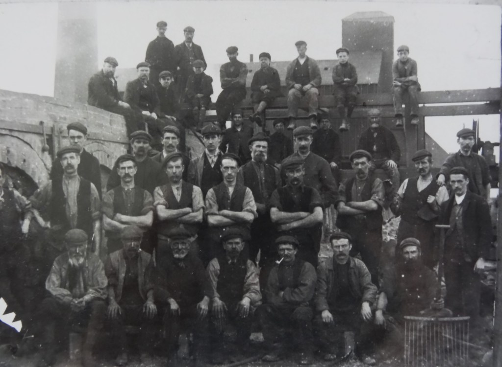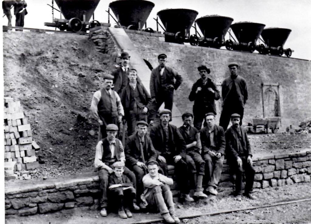 The buildings in the background look as though they are under construction. The older men are holding picks, the boys sitting at the front are holding “midgey lamps” for working underground. The chap to the right hand side of the photo sitting on the brickwork, wearing the hat, looks management.